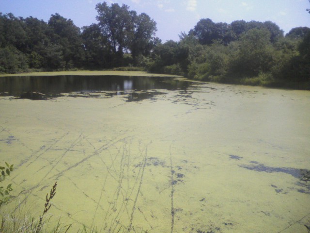 I gave up about 9am and went to another area. 17 acre lake and 2 smaller ponds. The temperature was about 90 at this point and sunny. The lake was clear and low fished it for a few and nothing here either. Just for fun I went to one of the small ponds. It was covered with some type of green seed like material. I discovered that a senko would barely sink so I started fishing and found a brown with silver flake in a 5 inch size that starting producing. I ended up catching 2 in the 15-16 inch range to salvage my day. I missed a few and some got off when they were caught up in salad. A buzzbait got clogged as did a spinner or just about anything else. My scumfrog was also ingnored. Any ideas on how to fish this pond? Curious to hear what anyone else would have tried. I am posting pics from my phone. The first pics are the area where I was skunked & the last pic is from the smaller pond where I caught some at 11 am. Notice the tracks I left. |