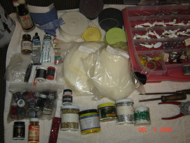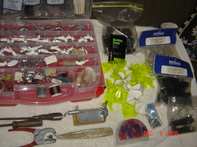 I am going to give everybody on here a chance to buy this lure making kit. I don't know much about any of it or what it is called but it came from my nephew. It has blades, White hair, wat to much to mention it also has the video and books to show you how to make them.Here is some pictures. I will ship if the buyer pays shipping if it don't sale in a few days I will put it on ebay. Lets here some offers.