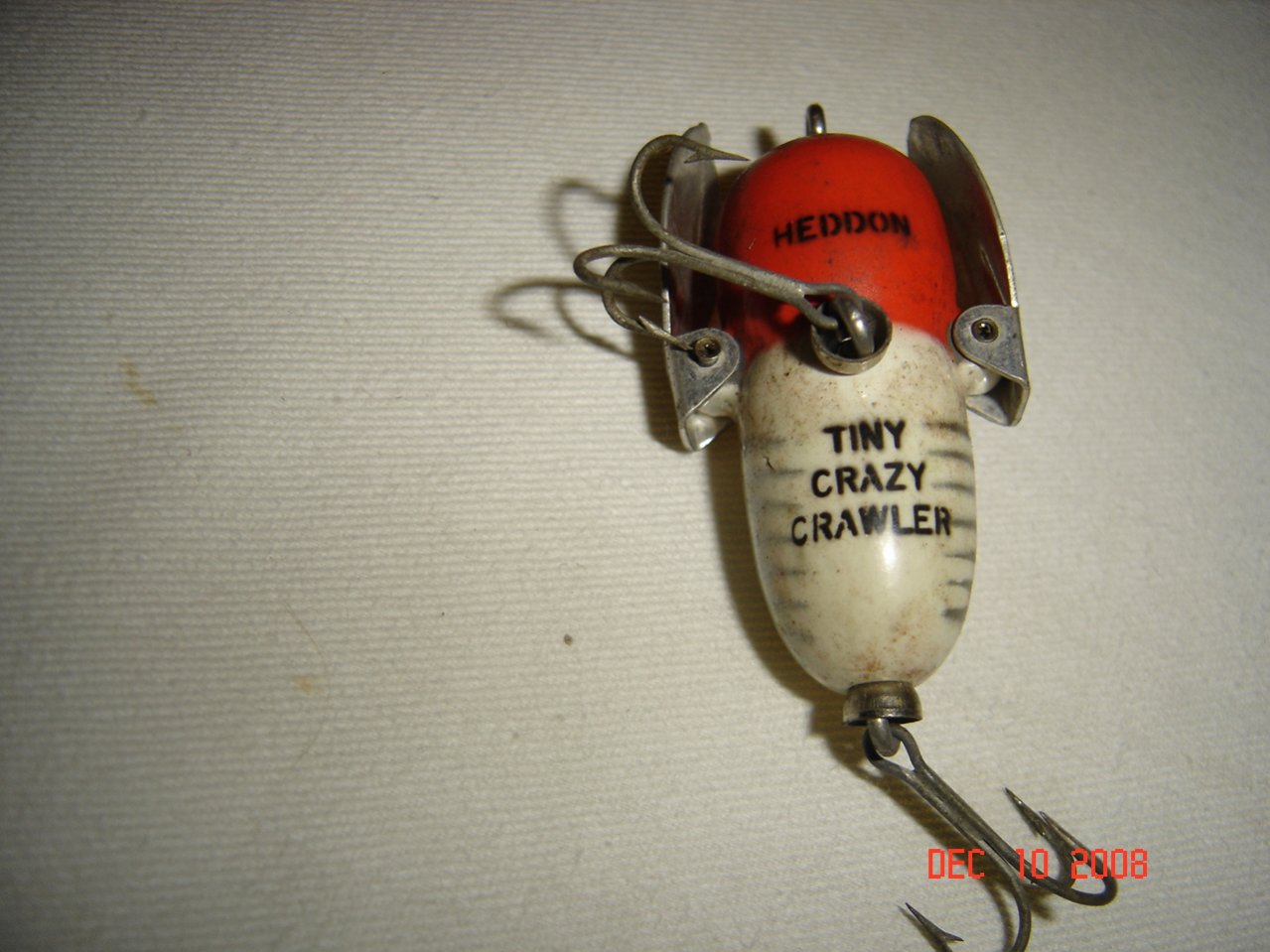The red and white top water plug is a Crazy Crawler. It was popular in the 50"s and early 60"s. I would call it a predessor to the Buzz Bait. when cranked it rock sides to side and makes a sound like a jitterbug. I have one exactly like it that I have not fished in years and dont know that I have ever caught a fish on it. I think itb was made by Heddon.