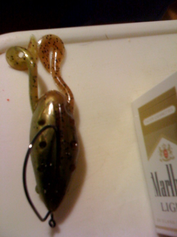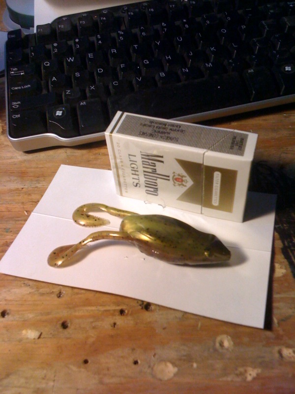Here is the side view. (Marlboro added for perspective) Hollow bodied. View from behind I like what they did with the underneath. The holes on the sides only go half way up the body. The frog stays afloat on the 6/0 hook that is in the picture. As far as casting, they have done fine for me. The only weak point appears to be where the legs meet up with the body. I suspect that they will be the first part to rip.