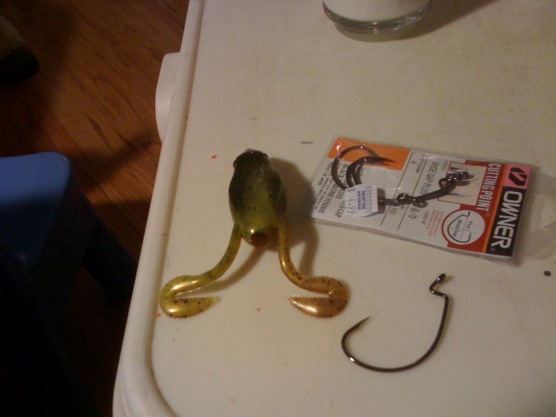 I didn't get anything too much out of the ordinary. Some 5 3/4" watermellon kut tail. A pack of sweet beavers. A pack of 12" midnight blue hand poured worms, some 4/0 and 6/0 owner hooks and then some frogs I hadn't seen before they are made by canyon plastics. I threw one of the frogs on and messed around with it in the pool this afternoon and love them. They sit a little higher in the water than most of the plastic frogs (horny toads and ribbits) and their legs have the action of a buzz bait. They stayed floating with the 6/0 hooks. I figured I would pass it on. I got the 4 1/2" grasshopper http://www.canyonplastics.web.aplus....gory_Code=frog