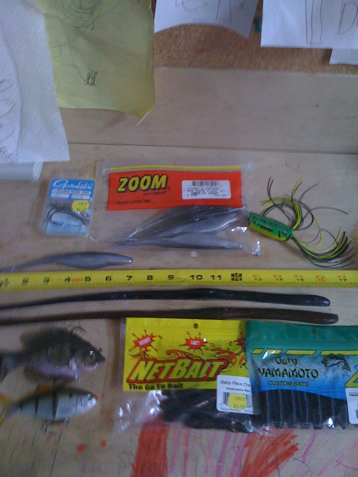 I picked up a BBZ-1 shad, a Matts Lure Blue gill, 2 16 inch worms, a pak of 7" super flukes, a pack of black fat IKA's, a Spro Popping Frog (hadn't tried one yet) some Gami Frog hooks, and the most important part, the Hannah Montana 5" closed face rod and reel combo.