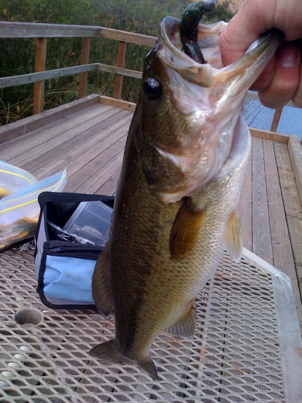 Today's incident can only be described as stupid. I went down to my lunch time fishing pond for an hour. I was tossing paca-craws on a 3/8 shakey head with some very good results. I landed three in the first 20 minutes, the biggest right around 3lbs. I was also tossing the floating BBZ around the edges of the tullies hoping it would get ambushed. I noticed that my Johhny Morris reel was making a little more noise than normal. It appeared to be casting fine, but just didn't sound right. The last time I had a similar sound, the magnetic brakes were not seated properly in the dial, so I figured I should check that. Now a smarter man would have reeled is line in and begun the inspection. Nope, not me. Following the weird sounding cast, I turned my reel on it's side and took off the side plate to check the brakes. I am sure most of you can guess what happened next. Yep, my dead stick BBZ caught the attention of hungry bass. While the fish was no giant by any means, it did a number on my half of a reel. My line, lure and fish went straight into the tullies without me being able to do a think about it. Tonight I will be adding line to my now empty spool and tomorrow back at it again. Moral of the story, reel disassembly with a line in the water is a bad idea. Here is the better fish of the day.