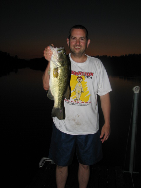 I was helping my nephews and niece catch a bunch of sunfish from the dock this past Friday night, but after they all turned in for the night, I put on a Leopard-colored Spro Dean Rojas Bronzeye Poppin' Frog and nailed this toad just before dark. 19" and 3lb 12oz by my scale. I have caught several fish on this frog already this year and it's quickly becoming a favorite!