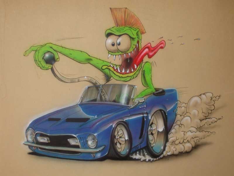 Thats cool....I like it.....I airbrushed a Ratfink character driving a hopped up Mustang on my shop wall one time as a demo for someone.....it survived the tornado bearly,so i'm thinking of cutting down that piece of sheetrock and making a picture out of it to hang up in the new shop....lol
