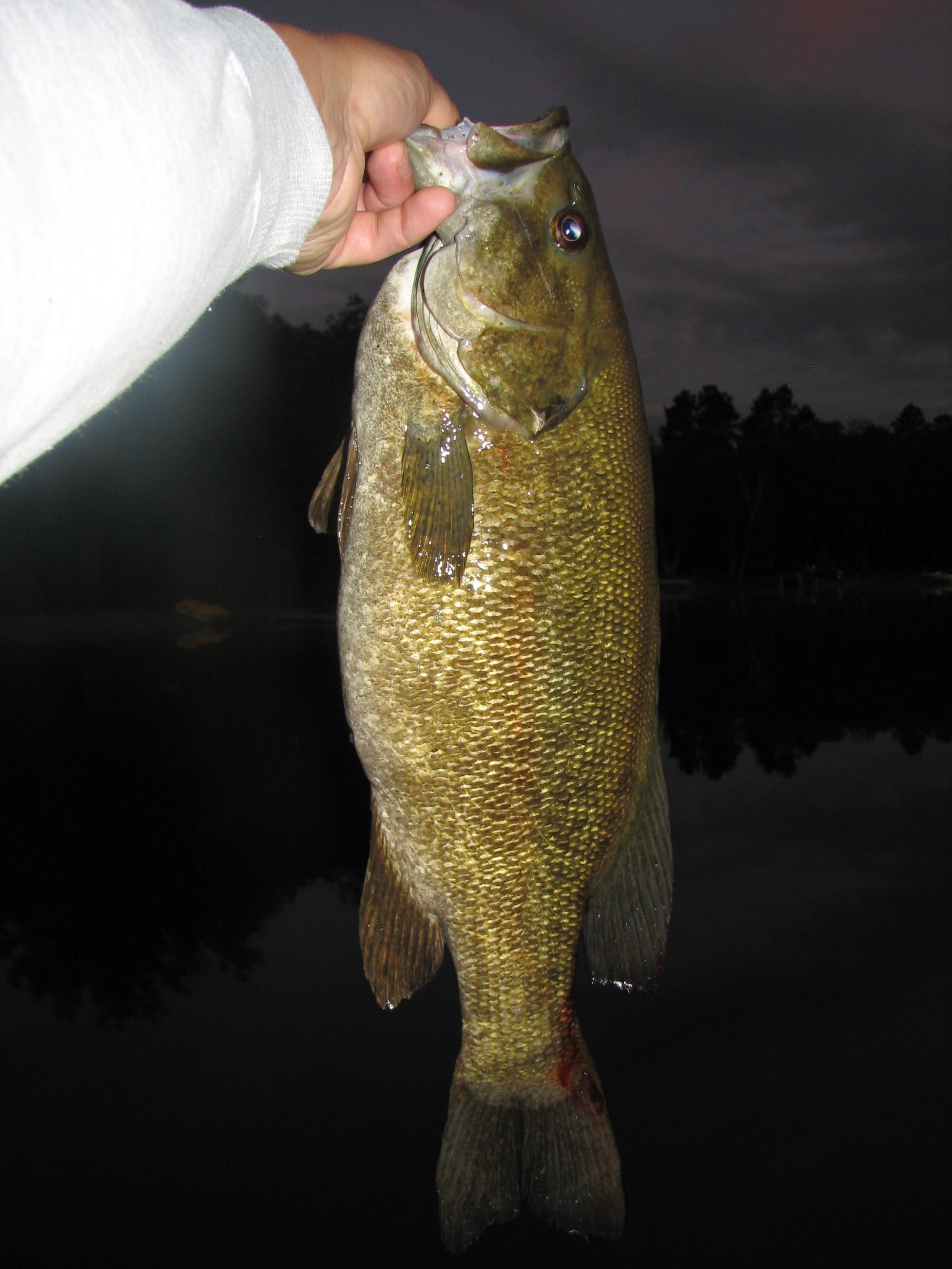 Fishing from our dock at 5:15 a.m. on July 3 using a Rebel P65 Magnum Pop-R (Ol' Bass color) and I caught this 3lb, 11oz smallmouth (18.5") to beat my old record by 8 oz. Since no one else was up at that hour, this is the best pic I could get -- it was nowhere near as dark as the pic makes it look.