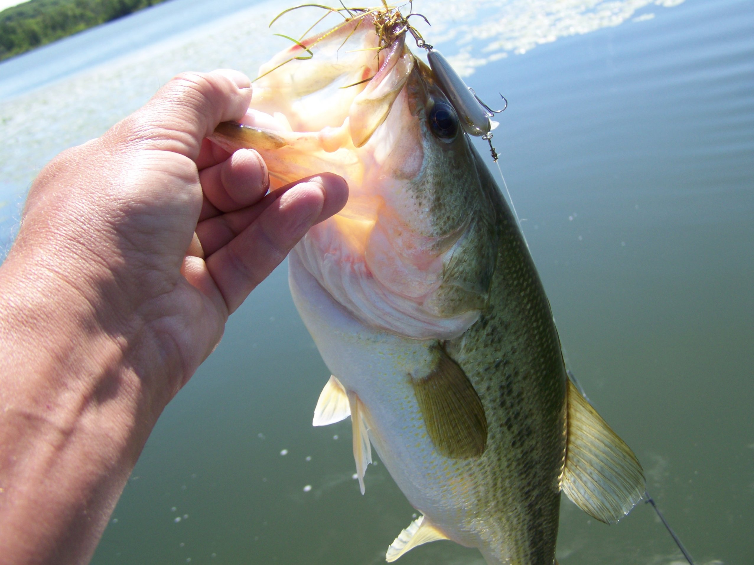 Hit the new pads pretty hard today with some pretty good action overall. Didn't get a pic or weight on the 1st fish I caught. Tried to grab his lip 3 or 4 times and he was havin none of it. Finally, he flipped himself off the hook. He woulda topped fish #2 by 1/2 # is my guess. Fish 2 went 3.0 and fish 3 (who I thought was a monster till I saw him for the 1st time!) went 2.3. Got 2 smallies as well, but only took a pic of 1. The first one was REALLY small. Some more pics of the lake if you're interested. By the way, both smallies hit on an XPS Nitro Minnow in Chrome Clown, and the Largemouths were all caught on a black and yellow Bobby's Perfect Frog. I really need to get to Gander Mountain and buy some more, since they're half off $6.99!