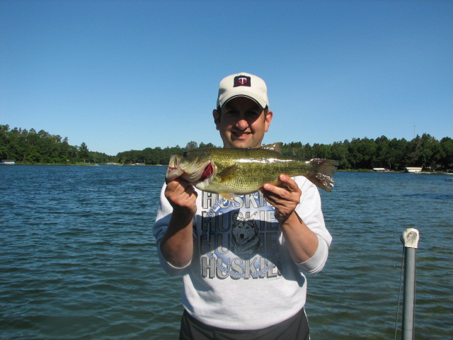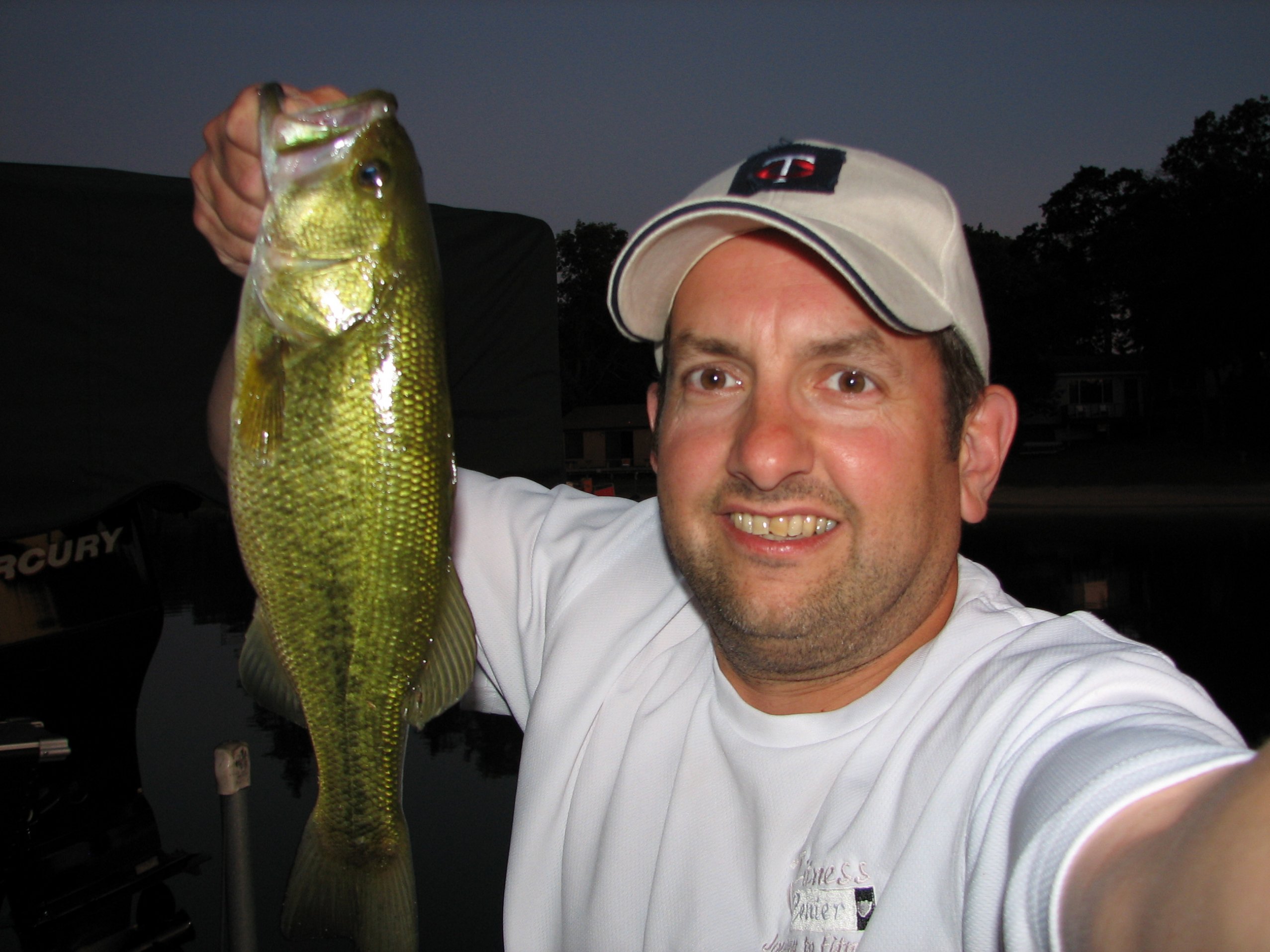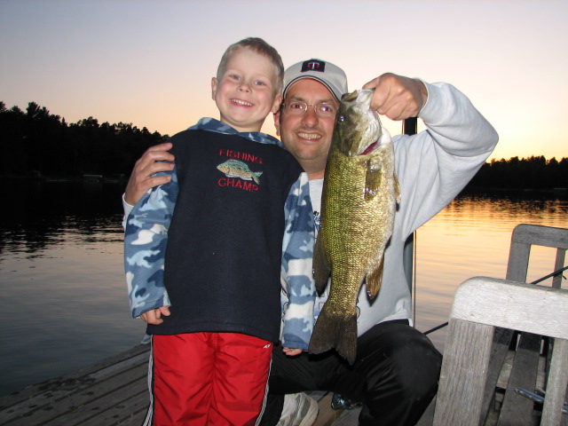 Later that night (9:15 p.m.) from the dock I bested my previous PB smallie by an ounce with this 3lb 12oz, 18" beauty using my "Ol' Bass" colored P65 Magnum Pop-R. My nephew, age 5, in the picture with me is a fish-a-holic. He is already able to cast and retrieve his own open-face reel and recently hooked and caught his first-ever solo walleye (22") while fishing with his dad. Finally, here is a self-photo of a 2lb 0oz, 14.5" LM caught on the Pop-R late Sunday night from the dock. Not a big fish, but my self-photo attempts don't usually turn out that well, so I thought this one was actually worth sharing. ![]() |