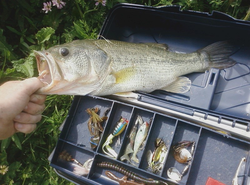 So I go to the pond and to start things off I threw a rooster tail. I like starting with a rooster tail because they catch the small stuff like crappie, bluegill, and small bass. This way I can get a nice feel for whats in the pond. First cast... nice 14" bass! I figured... OK! this is cool. So i started with the jigs, and worms. On my football jig, I caught another nice bass over 12" and bullhead that looked to be about 12"! I dig, I dig! So I move to the one side where there was some vegetation on the top of the water and where the wind was blowing and casted a 7" powerworm texas rigged ontop the junk. Gave it a few twitches and I got a strong hit! Took it under and i set the hook, and it took me at least 2 minutes to reel this fish in... my reel is also inda junky and skips, so that added to it. I knew it was a nice one... I reached down and pulled out this 18" largemouth! It was a beautiful catch! I just need to buy a scale to get the weight cause this thing was kinda fat! My guess would be about 4 pounds, probably closer to 3.75. Heres a pic of it, I couldn't get a pic of me holding it since i went alone so I took it by the tackle box so you can compare it to something.