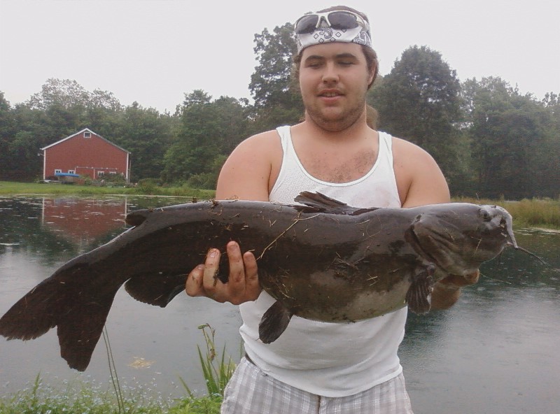 My friend bought a white top water weedless mouse. We got back and decided to try out some of our new equipment. We went to the pond across my friends house where we can usually catch a few average sized bass. First off, I loved my new reel, my old one skipped so much and was always really loose... it was pretty much shot. But I managed to catch about 7-8 bass in an hour and a half. I was very pleased. My friend was using his new Mouse, using it top-water over a bunch of vegetation.... he was having some trouble. On his first cast he got a huge hit... but he couldn't set the hook. After that, he pulled out one bass. He was starting to get a bit frusturated, and my friend is a long time fisher, hes the best among my group of friends and has the most knowledge and experience. I was fishing one side of the pond, when I started hearing a bunch of commotion. I turn to look and see my friend with his rod bent and a massive tail flopping in the air with water flying everywhere! This thing had to be HUGE! He says "Its a big one!!!" and I start jogging to where he is to watch the fight... Once I start jogging he yells "CATFISH!" I get over there and watch him fight this big cat. He eventually gets the cat up on the shore, and as hes dragging him in, his rod snaps in half! He then reaches down and grabs his line (14 lb. fireline) and the cat, then his line breaks! The cat starts flopping towards the pond, when I yell "grab him!" and my buddy leaps on the fish and pulls it into shore. We took a few pics and released the big fish. He was proud, it was a great day fishing. Yes he caught it with a topwater mouse, strange huh? Well, this is the only catfish in this pond.... how? my friend put it in there 3 years ago, and it's been growing since, and it's the first time it's been caught. |