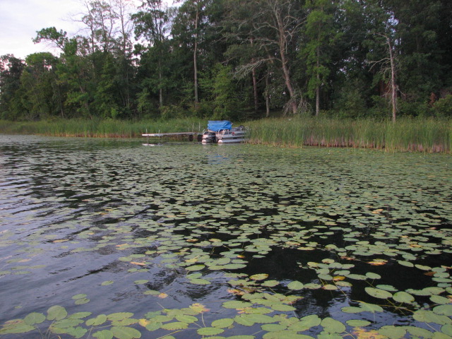 Caught a ways out from this dock where the pads aren't as thick as the surrounding area: Many shorelines & bays on the lake look like this -- I could frog all day! ![]() Couple more shots of the soon-to-be-released fish with my nephew: Shortly after the excitement of the big fish, there was more excitement when my nephew lost his "Scooby" rod to the bottom of the lake. He was dismayed. Luckily, with a 7-foot rod and a treble hook lure on it, we were able to retrieve it after several tries. I went out solo froggin' early this morning for about an hour before we had to head back home and landed a couple more. This one at 2lb 7oz was the biggest. |