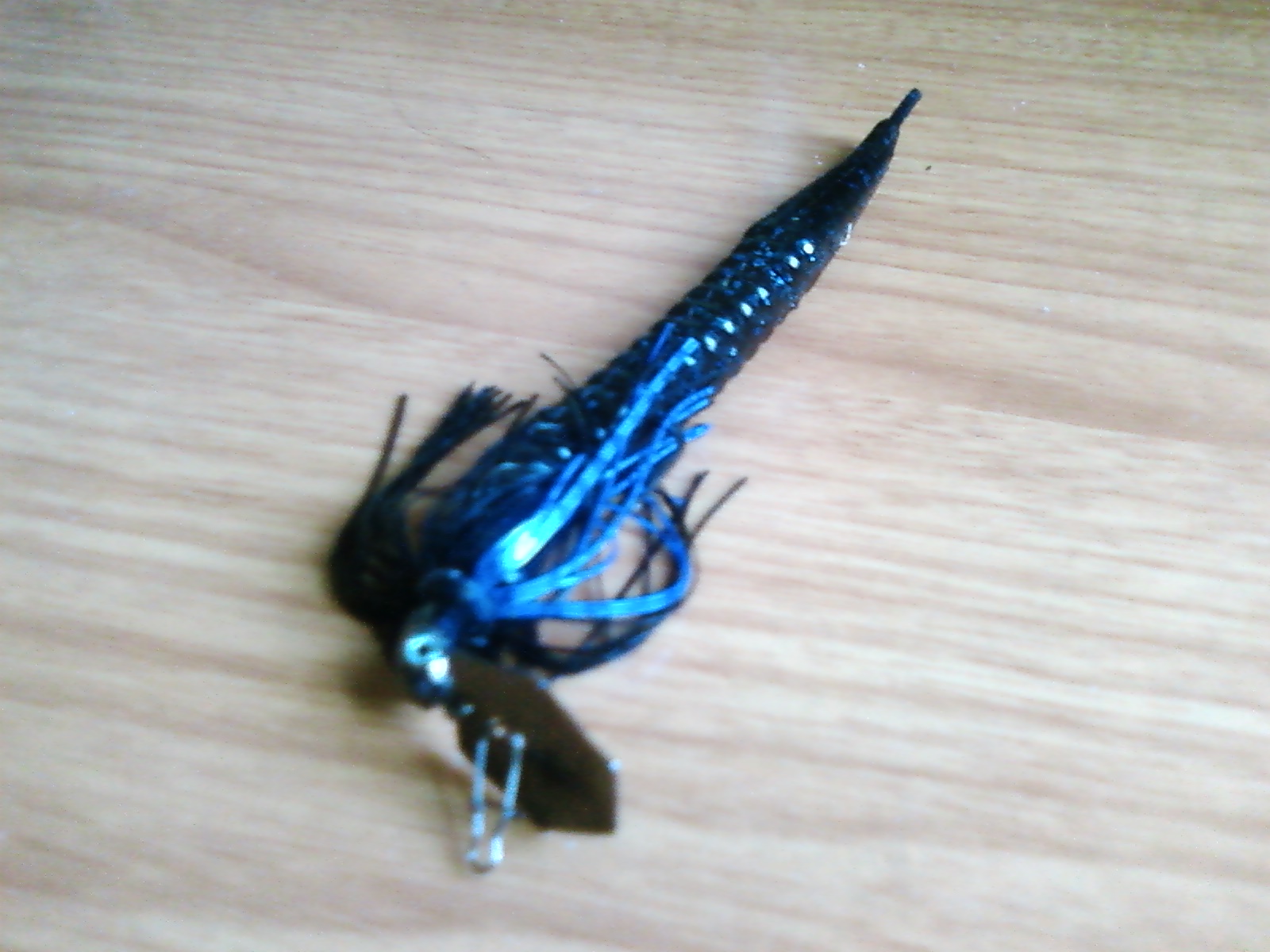 The other day a fish ripped the tail off one of my 10" powerworms and I looked at it noticed how well it would work as a big grub. And today I decided to rig something up with it. Here it is... Balck/blue chatterbait rigged with a black/blue fleck powerworm. Im anxious to see how this will work. What do you guys think? |