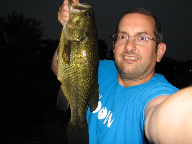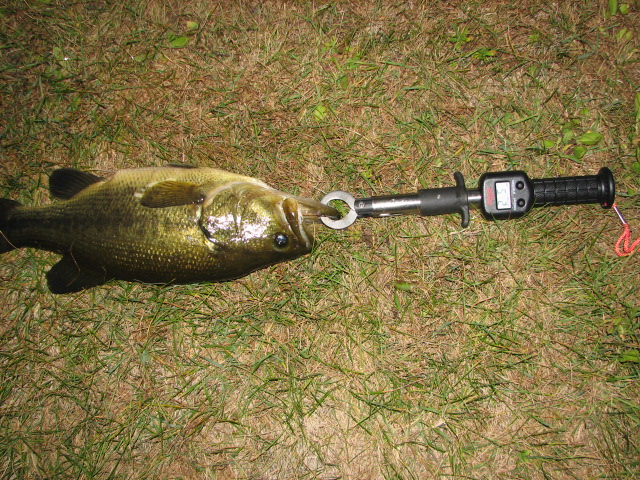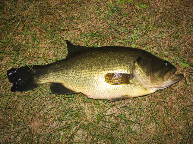 My goal this year was to catch my first-ever 5 pound bass. Last year was the first time I ever caught a 4-pounder, so I figured my goal was a pretty lofty one. Well, mission accomplished! I went to a local lake tonight to make a few casts before nightfall. I made a dozen or so casts in a couple different spots using a dropshot and was just getting ready to switch to a frog when it happened. It wasn't much of a hit and not much of a fight either, sort of like dragging in dead weight. I was ecstatic to get it to shore, though, because there is a huge bed of weeds near shore and topwater mat to get it through. I am still giddy about the whole thing!