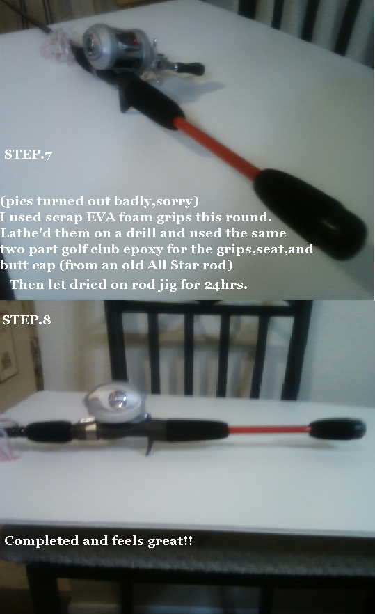 After talking with TnTom,he sent me a great article on extending rod blanks,and I was able to save the blank using an aluminum rod...Its adds weight but not near as much as I first thought.. after all was finished,the rod feels better than before,just slighty heavier,but not enough to kill your arm. Attached are the progression pics with step by step. Thanks Tom! You should be able to click on the pics and zoom in to read them!
