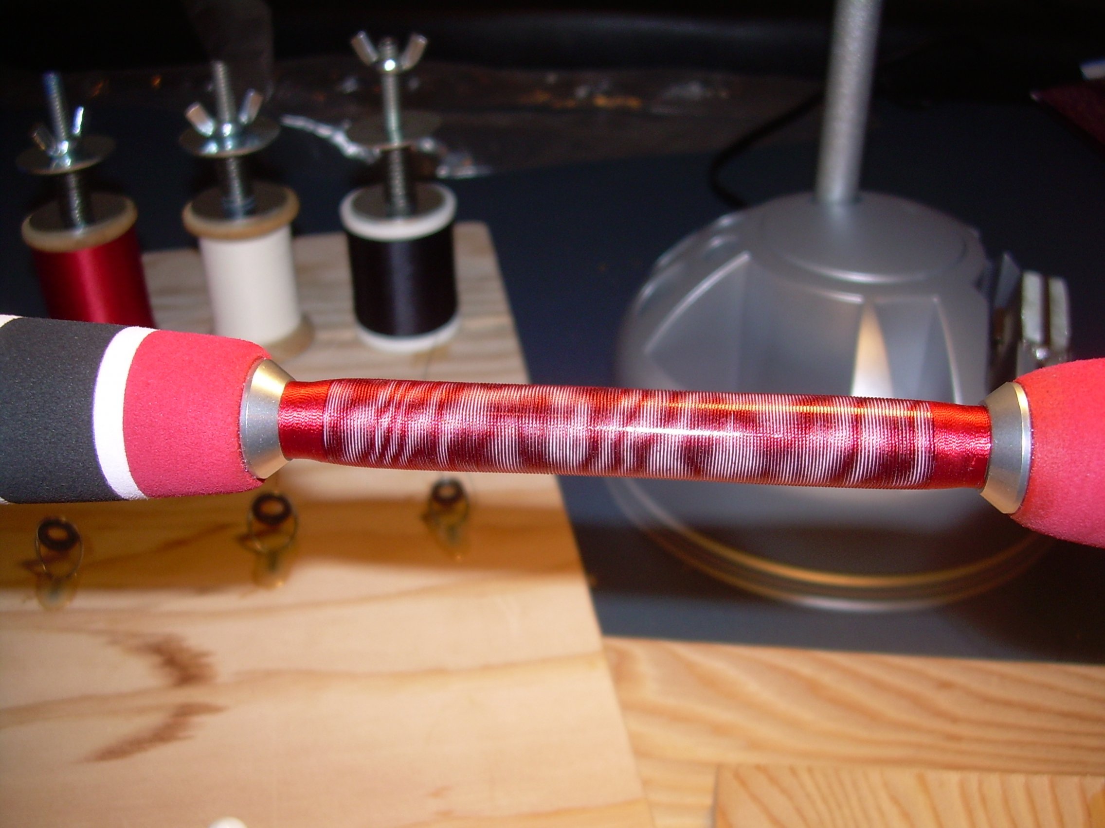 Awesome!! The black and white does look cool by itself,doesnt it?,haha.Did you already burnish it?..I just went in all different directions,It really doesnt appear you did much,you barely noticed the thread moved at all.. Heres an email I sent explaining how I did the thread finish on the underwrap..The more epoxy on the underwrap,the better the effect!! I went bacic...Blk/white under wrap and red/blk on top...(black being the sacrifice) So just three colors to test the waters.,,All NCP size A thread I put the rod on the motor and while it was turning I applied the first coat of epoxy going veritcally with the wrap so it wouldnt disturb the burnishing (I didnt use CP because I didnt have it at my house...My dad borrowed it,ha!)...and I became impatient. Once the first layer was on,I picked up globs of epoxy on my brush and just lightly ran it over the top horizionally,and spread the build ups as needed(which wasnt much at all...I did about 3 layers like that horizionally and let it turn all night on the motor and then let it cure for 48 hours. I was skeptical if I did enough at first,but after unwrapping the sacrifice thread and watching the illusion come through...hahaha...I was all smiles!! BB-Just make sure you let that epoxy set up before you start the top wrap. When I was working the top layer,and got to where I needed to stop the ''sacrificial thread'' I just cut it,and masking taped it back and contiuned witht the red down.,,,Hope that all helps. If you got any questions,please ask! Take plenty of pictures!! Islandbass- Im not fimilar with that forum....I only play on few,here and a local TX one...And a bunch of rod building forums now,but they move slooooow