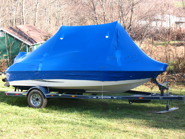 I bit the bullet and had it serviced and shrink wrapped, but I think I'll do it all myself next year. They strap two tall 2x4 masts fore and aft which is sure to shed the snow (and notice the two vents which should let any moisture escape.)