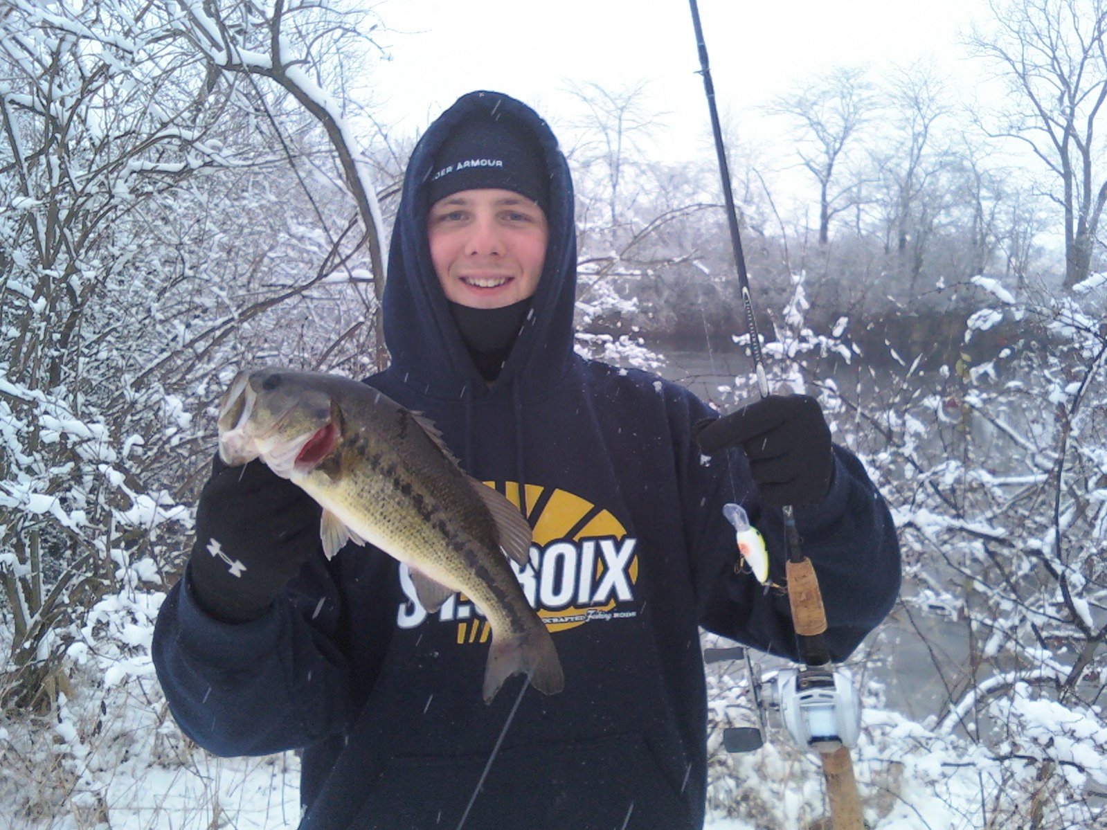 I've been going insane sitting around not being able to fish the past couple of weeks and decided to brave the weather and try my luck Saturday. It was about 27-29 degrees and snowing. I managed to catch 2 small frys. One came on a Strike King series 3 crankbait and the other came on a LC pointer. I was rigged up with 8 lb. P-Line CX Premium line on a Revo Premier. I was using a 6' medium power 2 piece rod that I've had since the beginning of time. This was probably one of the funnest fishing outings I've ever had. I was accompanied by my brother so during the lulls of not catching fish we took advantage of the snow and had a good old fashioned snowball fight! Here's pics of the 2 bass: