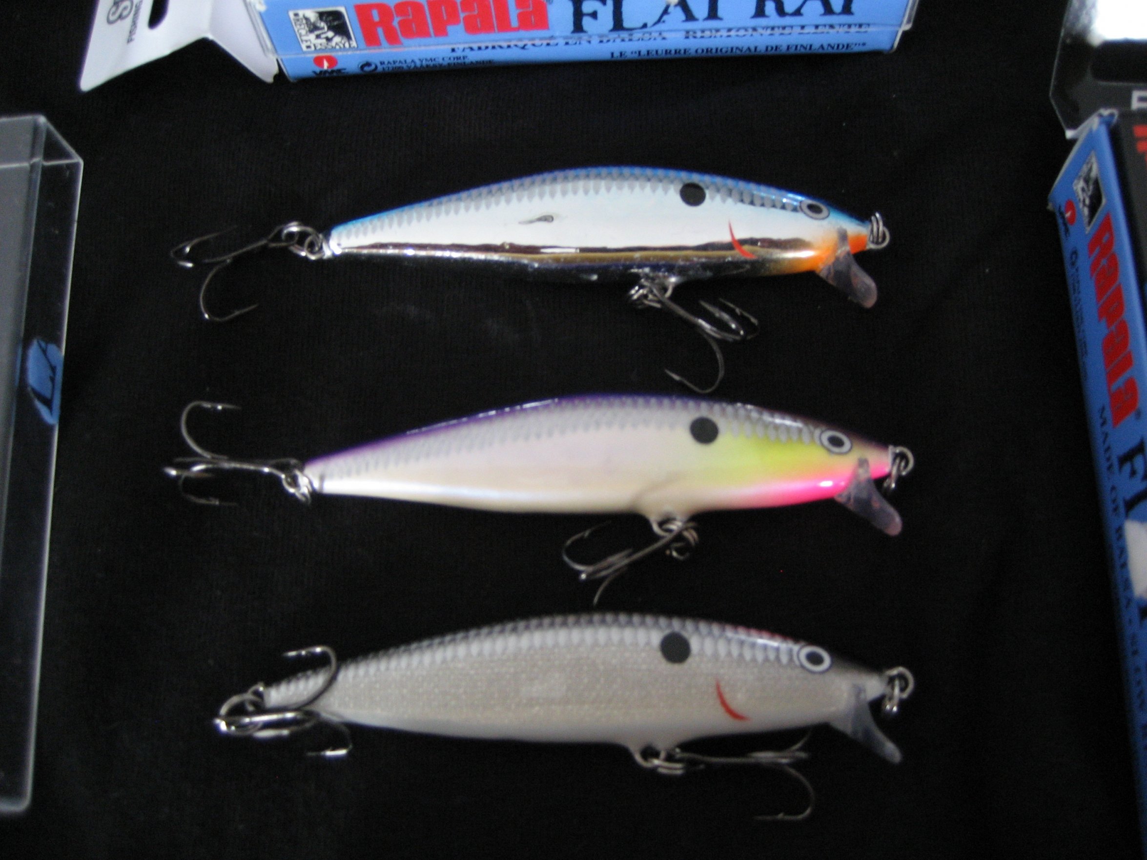 Brand new RAPALA FLAT RAPs (FLR08) in Silver (S), Silver Blue (SB) and Purpledescent (PDS). They dive 2-4', 1/4 oz, 3 1/4".