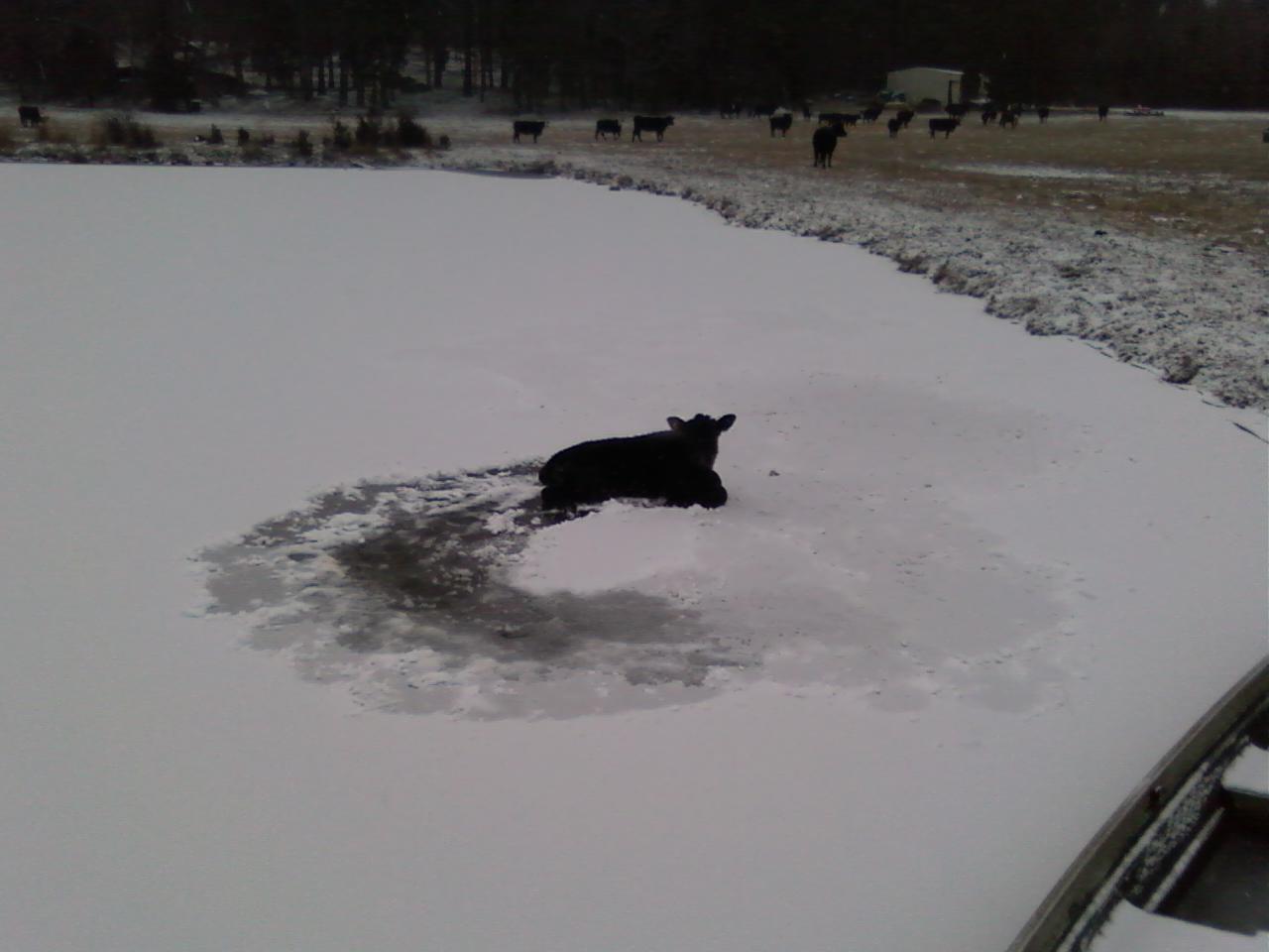 The calf would have been fine if not for it's excessive kicking, he fractured the ice and went through. After the calf decided to go through the ice I had about 20 seconds to decide that it was inevitable, I had to go in after it. The water at that part of the pond was a frigid 4 foot. About 2 feet further out there is a 3 foot drop which would have probably killed the calf (because I was not going over my head). Currently the little guy is dry and sucking teet. Also I am still trying to regain feeling from my chest down.