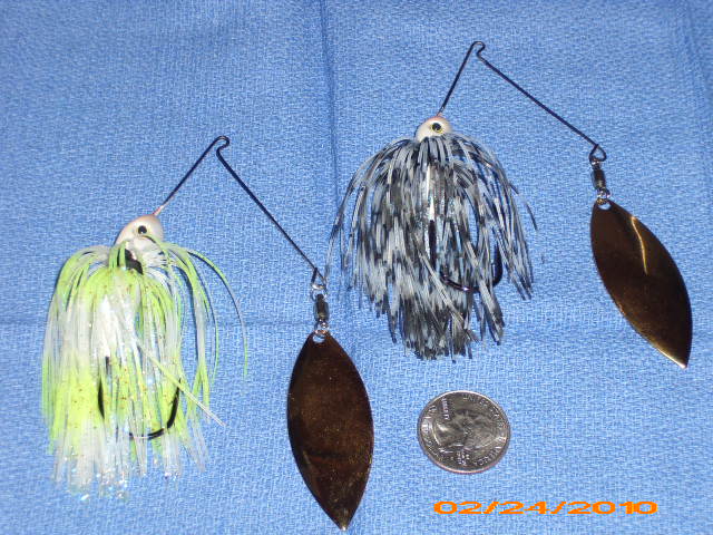 A while back I made a post about looking for custom spinnerbaits. I ended up just ordering the stuff to make them myself because what I was looking for was very hard to find. I wanted fairly heavy spinnerbaits with a big single willow leaf blade. These spinnerbaits are going to be very technique specific, because of the heavy weights and the large single blade they are obviously not designed to chunk wind all day long. I wanted the spinnerbaits for 2 things. 1. to slow roll, the heavy weights will help keep bottom contact and the large willow leaf blade will provide a lot of flash and move some water without giving much lift to the bait. 2. I also will be using these spinnerbaits to flip and pitch around shallow brush and willow trees which is a great way to catch big fish here on Grand Lake when the water is up. Most guys will flip and pitch jigs and soft plastics which I do as well but a lot of the times you can catch bigger fish by flipping and pitching spinnerbaits because you are getting a lot of flash and vibration into areas where the fish usually don't see it, this works best when you find schools of baitfish in the area. Anyways here are some blades out of my first batch. Half of them will be 1/2oz and the other half will be 3/4oz. The ones in the picture have a #5 blade on them and I have some #7's on the way. I will be making about 30 of these total and dividing them between the 2 colors you see here. I wanted the shad color for when the water starts to clear up and the chartruese for when the water is muddy. Let me know what you think.