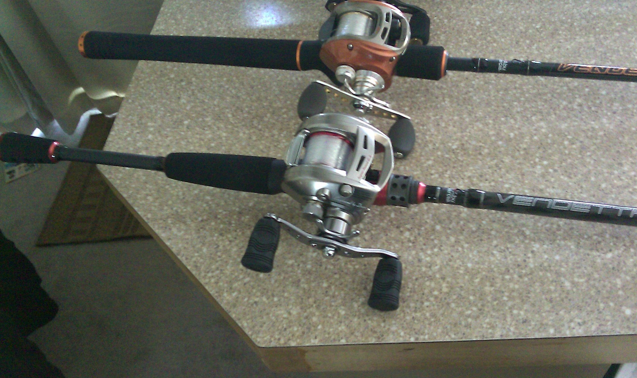 The rod is a 7' MH vandetta, witch I put a advantage hsta on. The reel is the new carbonlite, Dont know much about it other than the guy there said they cant keep them in stock. He was getting ready to put out for display when I was talking to him, so I told him to leave it in the box. It seems to be a nice reel, but feels toyish compared to the daiwa. The daiwa is a chuck. I put the carbonlite on a vengence rod. Sorry for the cell phone pics-