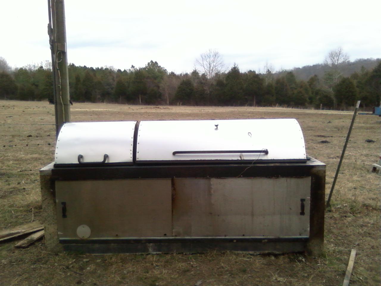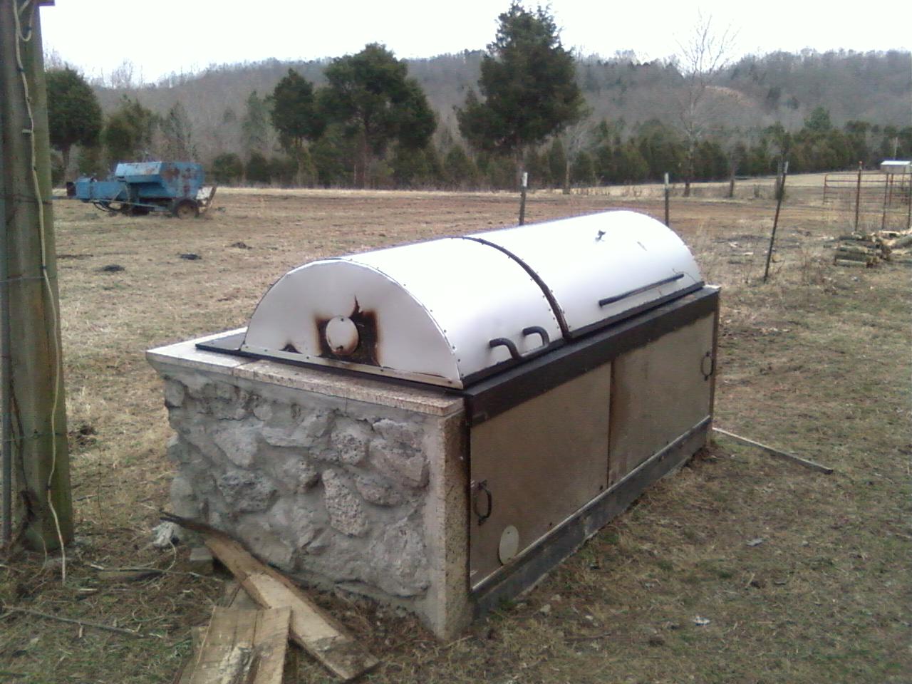 As you can see it's seen some use. We rebuilt it last summer as a sort of pet project, but I think it turned out great. Holds temperature like a champ. Notice my dads sort of unique touch to the frame(goes along with his business). Whadaya think? Sorry if the pictures are a little blurry. I took them with my phone while I was tearing out a fence row directly behind the pit. Pay no mind to the beasts in the background. (more trouble than their worth) BTW: If anyone can get these pics to Zooker, do so. I'm eager to hear his opinion of this setup. Plus the pics should put him in high spirits.