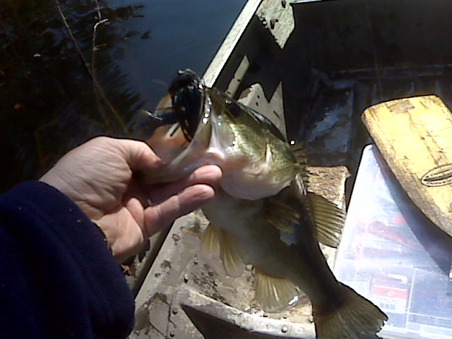 I got to make a little trip this morning to one of our state lakes. I dropped the boys off at school and then came back home and got loaded up. I finally got away from the house and on the water by 9:30. I thought my trip was gonna get canceled out by the game warden though from the get go. I forgot to get my life jacket and all I had was my padded seat for hunting off the ground. I tried to pass it off as a PFD and he said it wasn't going to work. I asked if I could borrow his or I would need him to open the honor box up and give me my 10 bucks back. He asked if I could swim, and I said you ever seen a fat man that couldn't float and got a chuckle out of him and he let me go on. He was tight lipped on the fishing though. I fished for about an hour and finally landed this 2.5lber on a 3/8 black/blue jig tipped with a Zoom speed craw in about 4' of water in some nasty muck.