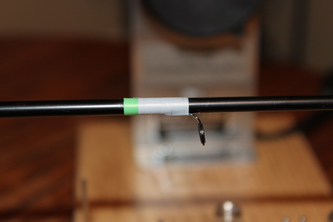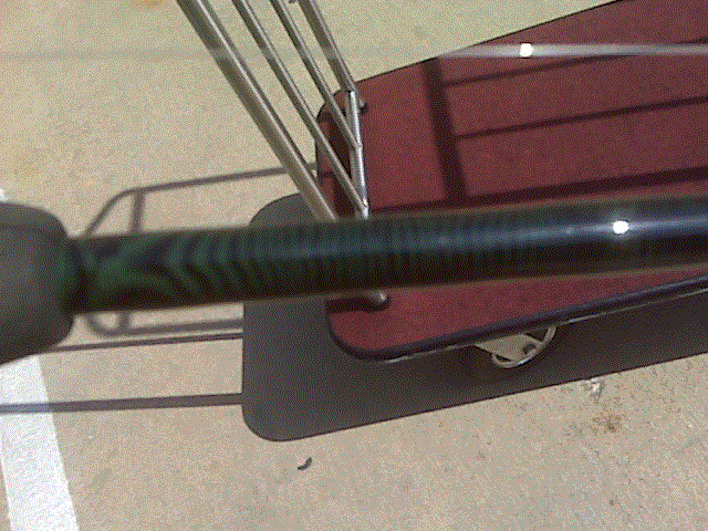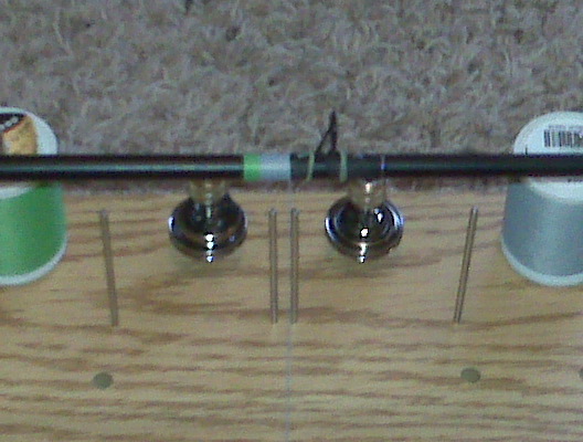 I used the lime green and black NCP for the base. It did turn out dark though for some reason. Maybe I should have laid the top layer in green. I am planning on getting a dowel rod and doing a few in different colors and to get some practice down on it. Here are a few more pics from the start up though of the guide wraps. I know the wraps look long for the guides, but I went with a smaller guide than the originals and I straightened up any of the gaps before I finished them. And the blank was scuffed where I removed the old epoxy. But the rod turned out balanced directly under the reel, opposed to 2-3" in front of the reel seat like it used to be.
