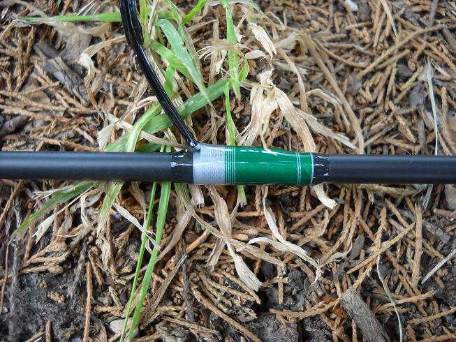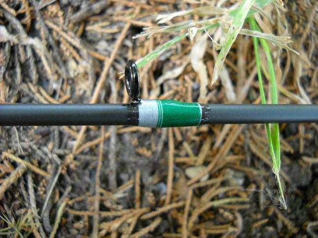 Thread is Madeira silver and green..Because of the silicone content in the thread I used three coats of color preserver to really seal it in to avoid fish eyes in the epoxy that can happen with this thread. Aero reel seat and my groovy grips.Forhan locking wrap on the large guides and normal locking wraps on the running guides.