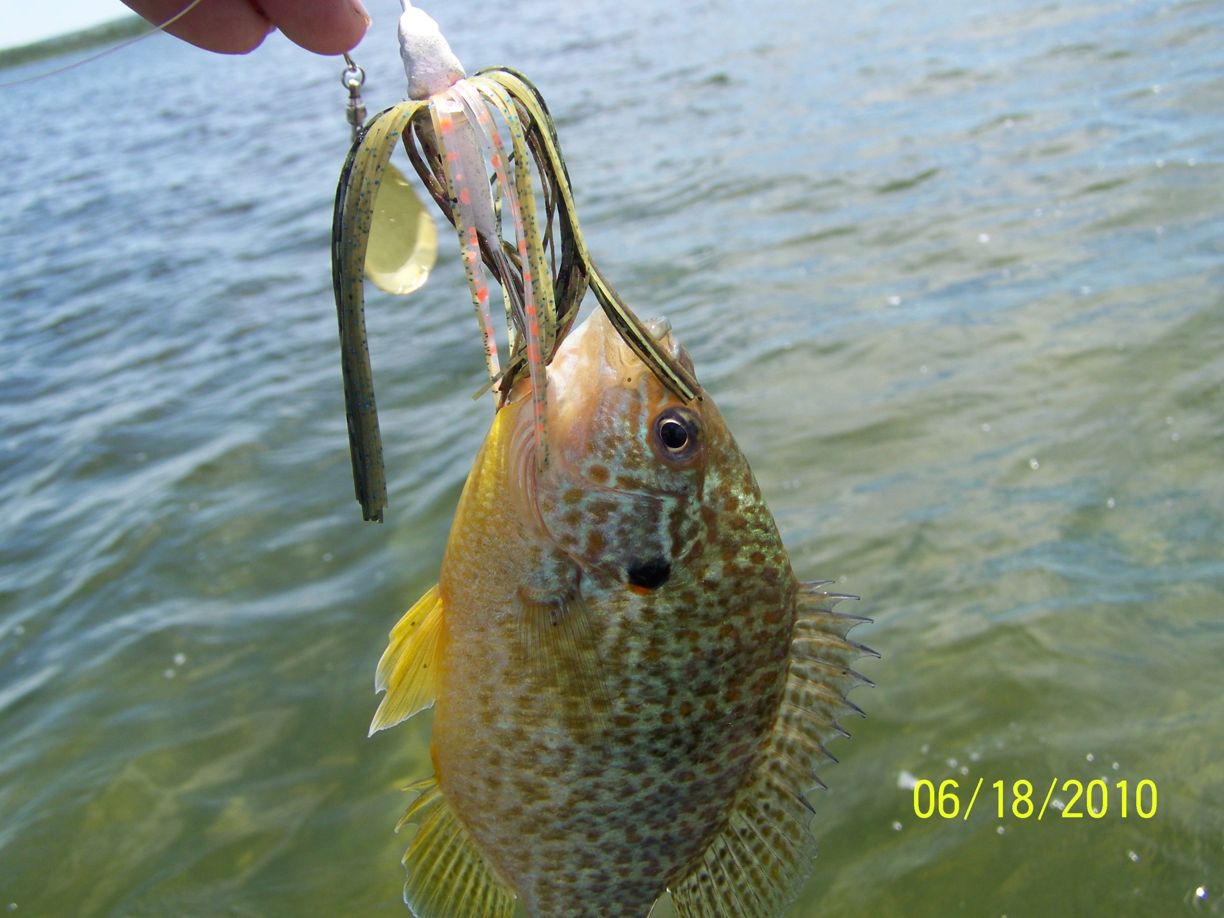 So I headed back to the lake for the 3rd straight trip. Caught 8 or 9 when it was all said and done, as well as 2 that outfought me and 2 that came unbuttoned as I grabbed the line to haul em outta the water. Nuthin special, other than the punkinseed that somehow hooked hisself under the throat. The 4th pic is my first bass on my new Ozark Craw skirt. Had pretty good results with it by the time it was all said and done. Biggest on the day was 3.7.