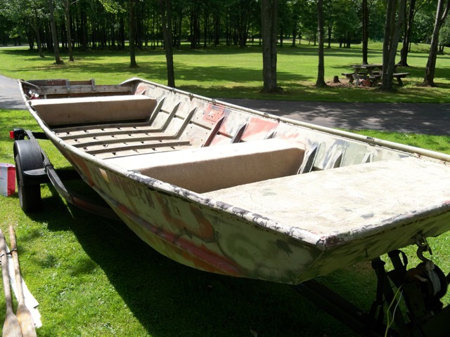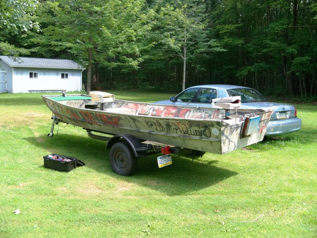 Haha, so after about a year of looking around craigs list all over Northeast and ebay for a jon boat, i finally stumbled upon one in my hometown at an amazing deal (that WOULD happen). My whole plan is to find a jon boat and trailer, clean it up, paint it, modify it, and catch bass with it. So this is what i picked up just a few days ago and i am pumped!!!