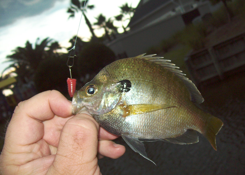 I was having another abysmal time on the lake yesterday, when I suddenly gave up, tore a tiny section of a plastic worm off and put it on a panfish hook. Bada-bing, bluegills! Certainly better than nothing, but I still wanted a bass. So I put a new worm on a t-rig and worked. Nothing. Tried a few more colors and shapes, still nothing. Then I got it in my head, it's gloomy and dark out, bright colors. So I put on a lipless crank in fire tiger. First cast I got a big bass on, but he got off. Same cast another bass, the one in the pic, hits the crank right after the big one gets off. I ended up landing him and getting the picture. Unfortunately we got chased out by lightning and rain after that. Still, it was fun to catch anything!