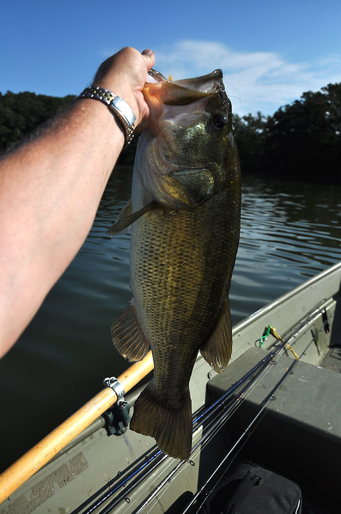 Gotta tell you guys this one last story. I was pitchin a Reaction Beaver and the pitch ended up going over a small twig about 12 inches above the surface. While the Beaver was dangling just above the water, a nice 3 pounder came up out of the water and nailed it! Now that was very cool to see. Overall it was very tough going today. You really had to work it. But the big girl sure made the day!