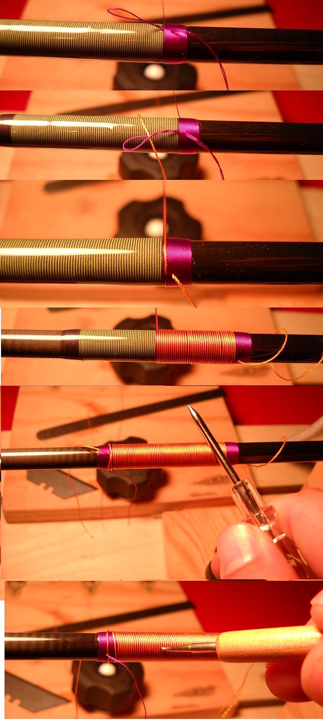 ...I like it,but I dont know yet.The pics show the progression of doing the overwrap...I started with purple which is my main color (size A)....Then added the orange thread which will be my sacrifical thread (the thread we will remove) The orange is size D..I wanted a wider spacing inbetween the purple to let more green show through from below.I also took picutures of my regular burnishing tool to pack the thread(which is just a circuit tester that I hit with steelwool),and then again of my tiger burnishing tool that I do next. Once I unwind the sacrifical thread off (my favorite part )..I do a coat of color preserver (not pictured) let that dry,then a coat of thread finsih to even further the moire effect of the tiger.The pictures add more lines than there really is...But it looks really sweet in person. Im also working on a new grip inlay with lime green foam to match the green thread....So far,so good...I was scared it wouldnt sand smooth,but so far its great! Im think Im done testing???...I hate it when I cant edit stuff