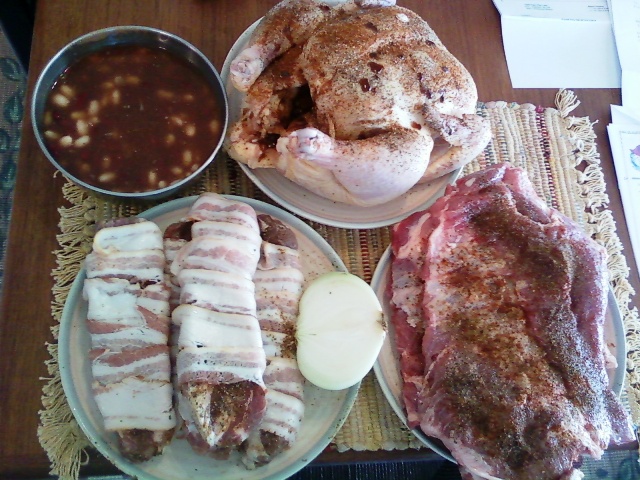Yep, fired up the smoker yesterday. Made up a batch of my ultra secret rub and laid out the menu. One chicken, four large ribs wrapped in bacon , a whole rack of ribs (which I had to cut in half cuz they wouldn't fit), some beans, and a half onion.