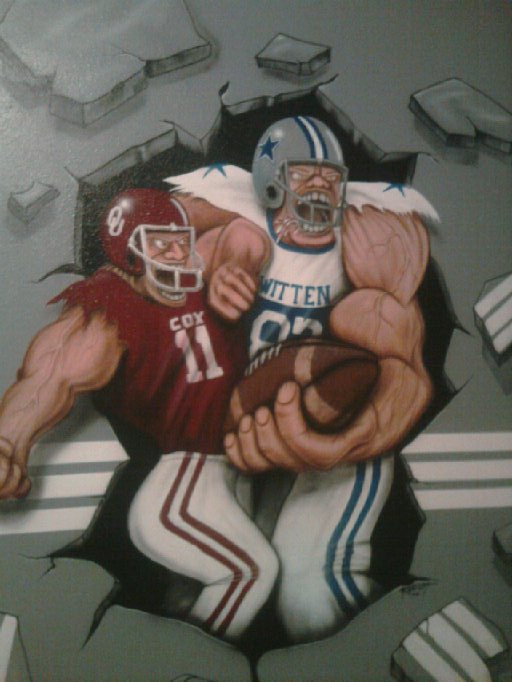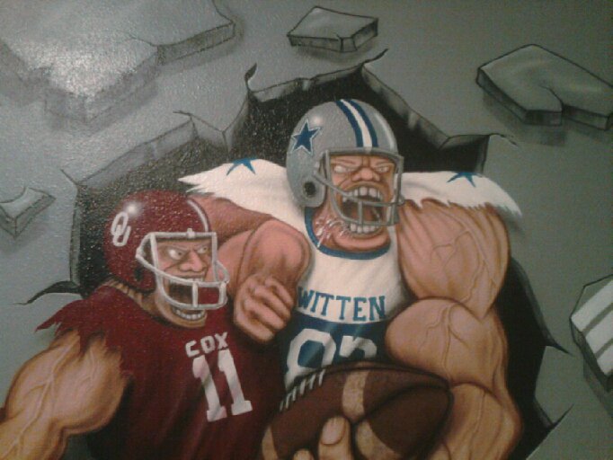 As you might remember, I came to Florida to visit my oldest daughter, and paint a wall mural for her husband a couple of weeks ago. It took awhile for me to come up with a design that incorporated what he wanted and yet allow me to have some artistic freedom and add my own flair, but in the end this is what I came up with. I know it ain't the typical football theme, but thats how I roll....lol