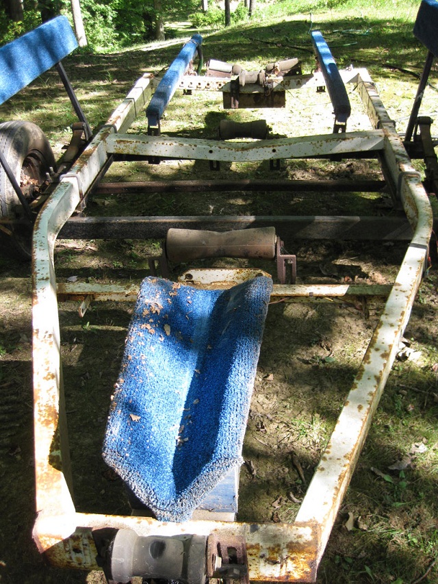 Thanks for the welcome bama! I'm sure I'll find a lot of good resource from the forum. I wish I'd have taken pictures from the start of re-doing my boat. The wiring was the primary damage having to start over again. I'd say I removed 3+ bushels of walnut shells and you can imagine the left over filth and the boat smelled like urine. I sprayed it down inside with clorox and let the hose run for hours with the drain plug pulled. Here's a pic of my suspended boat and a pic of my trailer before changing it over to a bunk.