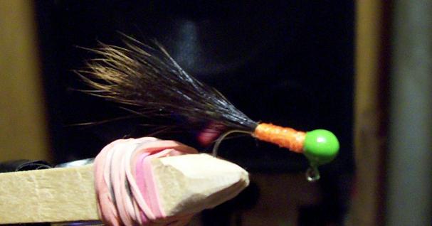 1/64th oz... lime chartreuse head... orange body... black squirrel with highlighted tips.