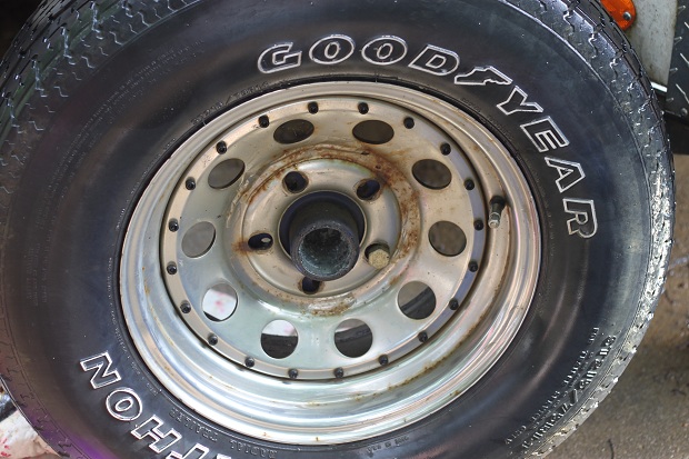 2 New Carlisles Tires ST215/75R14 on it. The wheels are nothing fancy but look better than the old ones. It was not a bad job and I feel better about towing the boat now. We are keeping the old ones, throw one in the back of the truck for an extra spare on longer trips on longer trips. Old wheels and tires----New wheels and tires I hate the thoughts of having to change tires or bearings on the side of the road.