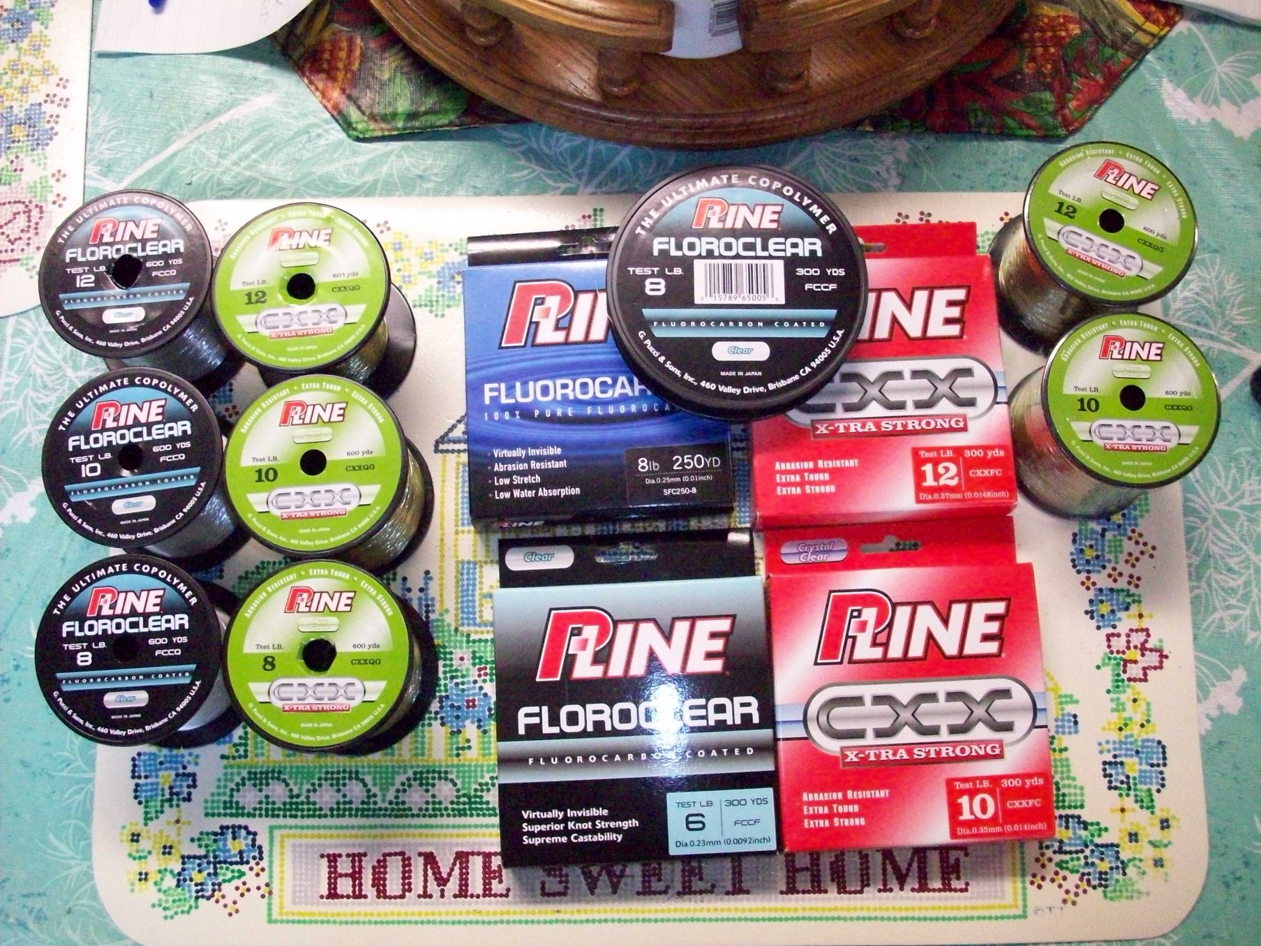 (Taller spools in the picture were 600 yd. spools.) Partial Spools: 6lb. Floroclear 8lb. Floroclear (part of a 300 yd. spool & part of a 600 yd. spool) 10 lb. Floroclear 12 lb. Floroclear 8lb. CXX - Green 10lb. CXX - Green 12lb. CXX - Green 8lb. 100% Fluorocarbon New Spools: 600 yd. - 12 lb. CXX - Green 600 yd. - 10 lb. CXX - Green 300 yd. - 12 lb. CXX - Clear 300 yd. - 10 lb. CXX - Clear Ryan