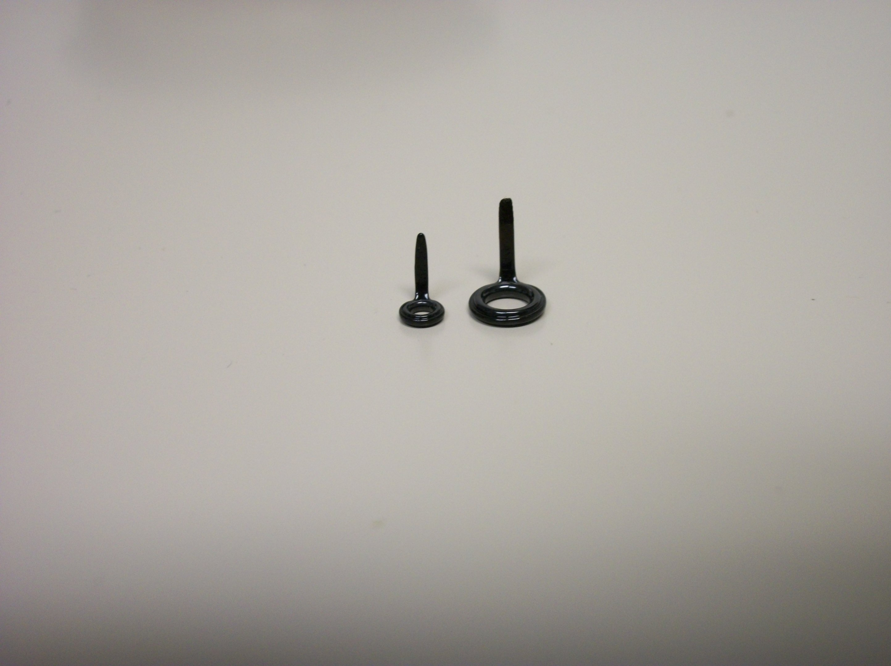 Here are a couple of pics of guides for comparison. The small one is a Fuji size 4 micro and the larger one is a Fuji size 6. The 6 is the smallest guide used on any production rod with conventional sized guides. These rods also usually go up to at least a size 8 double footed guide which is considerably bigger. When I build a rod with micros, I will use all size 4's. That creates a huge weight reduction out toward the tip of the rod where it matters most.