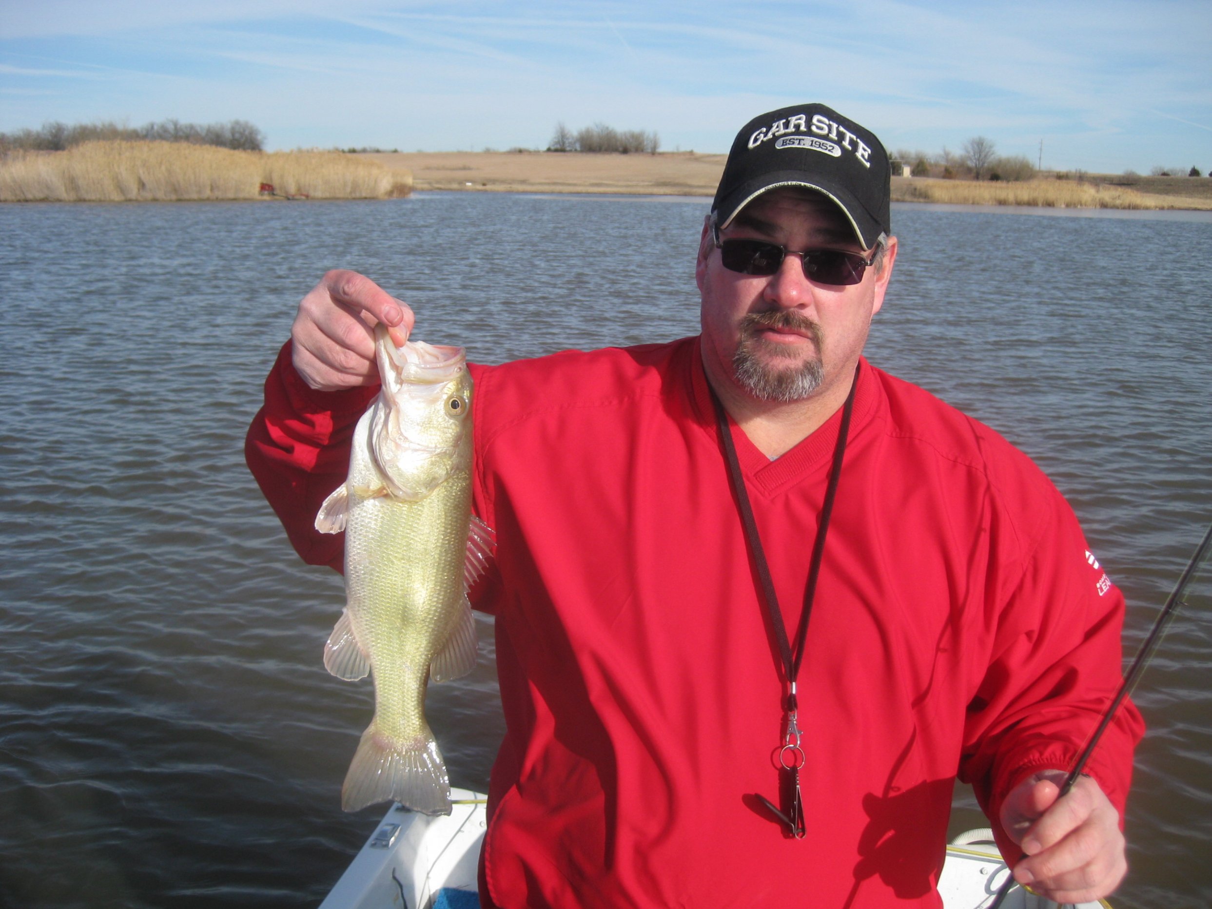 The weather forecst today was for sunny , mid 50's and low winds. It looked like a perfect day to try some winter pond fishing. Tony and i met at a private pond up North of town. Everey pond around here is open, but we got to this one and it had a glaze of ice on it. I thought it was just a thin skin of ice as the area where i launched the boat brke up easy. As we started to go and got to the ice edge, the boat stopped. The T motor would not go at all. The Ice was almost 3/8 inch thick there. We almost gave it up, but there was an open area in the middle of the lake so i fired up the outboard and started breaking ice. At an idle speed, the little fibergalls boat cracked and broke a path through the ice out to the open water. I have a few new scratch's in the pait but the ice didn't hurt the boat, thankfully. On my firts cast with a 78 pointer jerkbiat, i caught a chunky little 14 inch bass. I thought it was game on but it looked like that was the first cast jinx. Didn't catch another all day. LOL. To get more open water, we spent a good hour using the boat to break ise and then turning circles to make waves to crack the ice and wash it away. We got most of it open but still couldn't find active fish. Tony finally caught a little crappie on a jerk bait and then not long before we were ready to call it a day he caught a fiesty bass just a bit bigger than mine. All in all, it was a good day, a little chilly but not to bad.
