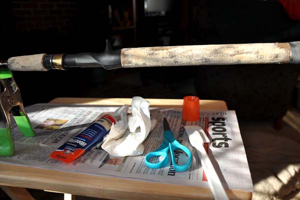 First I want to give my thanks to Garey and Walker for their guidence in this project. Your assistance was very much appreciated! The rod I worked on is a rod that once belonged to our friend Zooker. It was obviously a rod he used extensively. It was well worn with many cracks, holes, and chips. I recieved it last year from Zookers mother through John and wanted to restore it so that the rods integrity could be preserved. I intend to continue to use this rod and the reel that came with it. I'll be thinking of Zooker every time I land a bass with it. I think that would make him smile. The finished product looks pretty darn good I think. It's not like perfectly new, and thats not what my intentions were. There are a few minor inperfections here and there and thats what I wanted. It helps keep the rods character. So here are a few pics of the project as it unfolded.