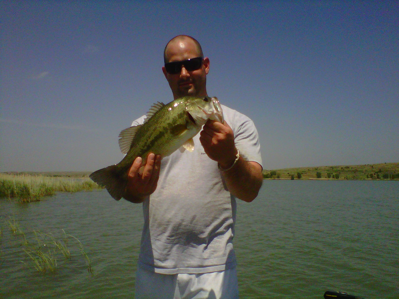 Gorgeous day. Warm, sunny, calm, and hardly any boats out. Just a killer day. We started out fishing for smallmouths in the morning around some rocky points. Took a bit to figure them out, picked up a couple here and there on a crankbait and a spinnerbait. Finally we pulled off some big hunks of rock on a point and slowed down. I started throwing a T-rigged green pumpking craw tube, and my dad threw a ribbed finesse worm. We waylayed them off that point for about two hours. Most fish were 15-16 1/2", with a few shorter fish and a few largemouths thrown in. Nothing real big, but good action. After the bite slowed, we cut across the lake to a big cove. Caught a few more smallies off some rock, and then as we cruised around we saw some largemouth up in some weeds on beds. So we pulled up on a stretch of reeds with weeds out in front of them in the back of the cove. The largemouth were there! We worked them over on one stretch of reeds about 50 yards long. Hits on about every cast, whether up in the reeds or in the junk out in front of them. Unfortunately, we missed just as many as we got in the boat. Nice fat fish, but again, nothing over 3#. After that, we ran up to the far west end where there's a bank of reeds about a half mile long. Hoped we'd find some bigger largemouths, but just numbers of 15-17" fish, all on jigs. Once the bite slowed, we went back to rocky point and caught another 15 smallies and called it a day. All in all, it was an awesome day, fish everywhere. I was hoping to get into some larger females up in the reeds, but I can't complain, we had a blast. I took our camera hoping to document some awesome fish, but after taking one picture of the first good smallie we caught, it died. So here's one decent largemouth out of the reeds taken on my crackberry, which takes just terrible pictures. Jesse |