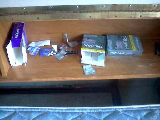 I've been working at our local college this week and today I was working in a couple of the student dorm buildings. The students have left and the cleanup crew hasn't started yet. Walking past an open dorm room door, I did an about face to see if what I saw out the corner of my eye was correct. And it was! And those are economy size packages my friends. Someone was working very hard and no doubt enjoyed his year at college to the full degree. Thinking about this scene though, I pause to wonder if perhaps I am jumping to conclussions. True, these packages were on his shelf/headboard of his bed, but perhaps they were part of his tools for higher learning. Perhaps, just perhaps, this guy is a med student who is planning on becomming a gynocologist. Perhaps he is just trying to learn all he can about a womans anatomy before graduating. He just might end up being the doctor who saves your girlfriends, wifes, daughters life some day.