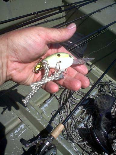 I did have one real nice one on my StrikeKing 3XD that Secret Santa gave me, but it came unbuttoned before I could see it. The storms didnt seem to have any effect on the fishing. But the front did. But working deeper water with cranks got some action. I did have an accident today. I impaled my finger with a treble hook from my LC popper. The point burried itself nearly all the way through my finger. So I forced it through the rest of the way, snipped off the barb, and slid it back out. My first time for ever doing that, and I hope, my last! I did land a nice 20 pound anchor though! In perfect condition too! Brought that home with me. You can see the lure I snagged the anchor rope with. It's one of my favorite crankbaits. StrikeKing Series 5 in Citris Shad. So glad I didn't loose it. Getting those hooks out of the rope is gonna be fun though. Ok, that my report for the day. Time to order pizza!