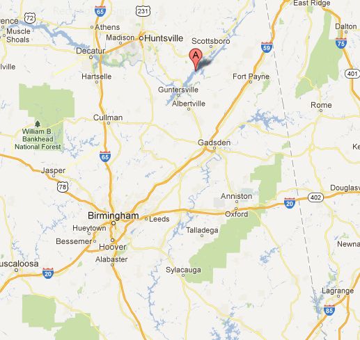 But the good news is, our buddy Bama ain't nearly as far away. Draw a straight line down from either the R or the T in "Fort Payne," and stop about halfway to that lake, and there's his house.