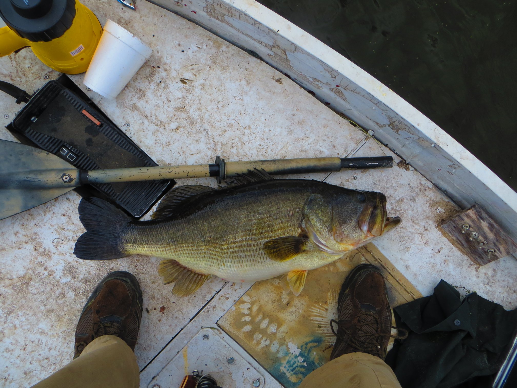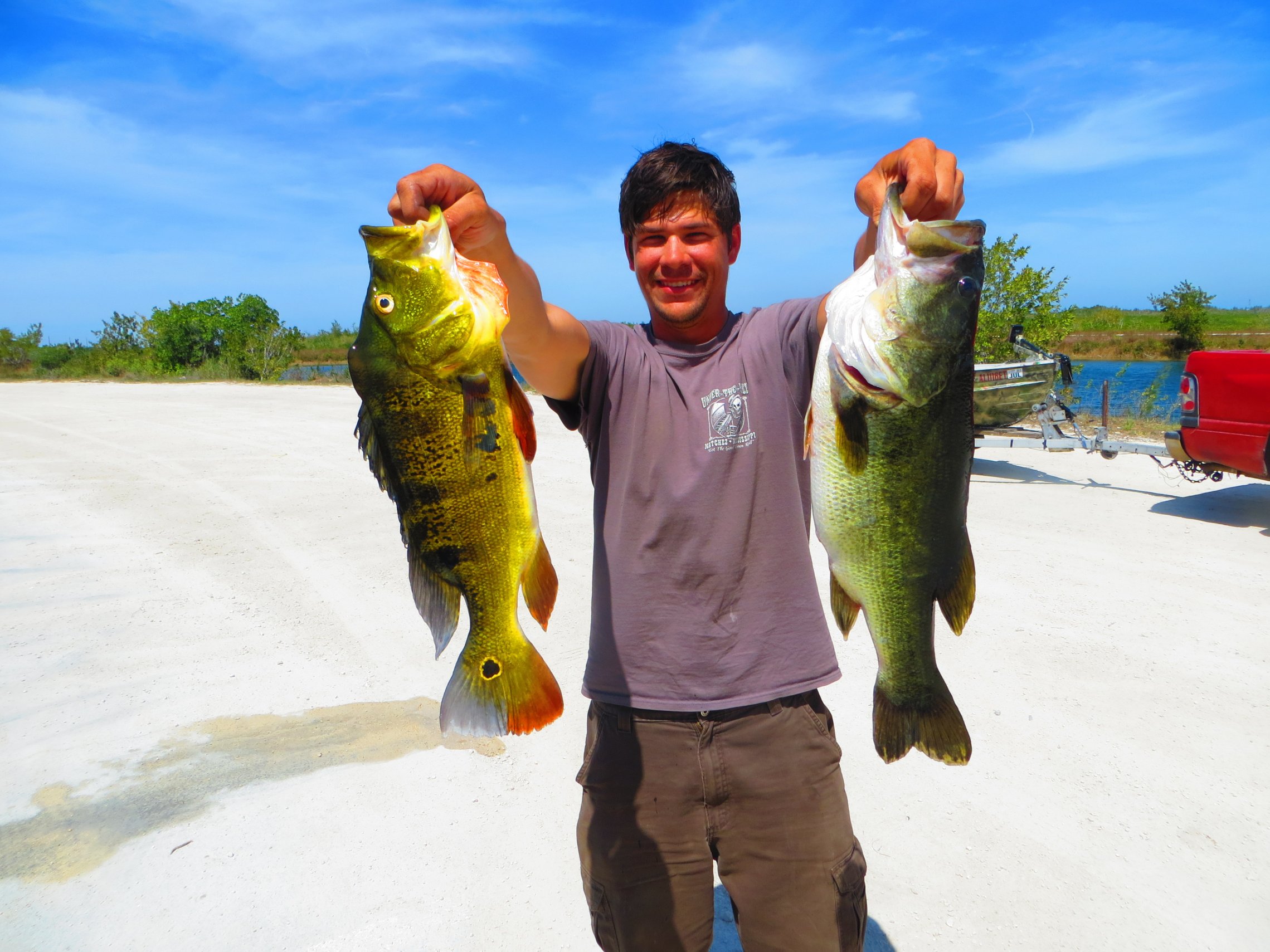 First is my largest bass ever. I dont bring a scale anymore, but I carefully measured it and it was 25 inches in length with a girth of 20 inches...a very fat female bass. The BPS calculator, and most online calculators indicate this would be around 10 pounds 7 ounces, and that certainly jives with my estimate. For years I had sat on around 9 pounds according to who you asked, but now I am sure I broke the 10 pound trophy mark. It was caught in some lily pads on a spinnerbait with white willow blades, which is also the same general spinnerbait that has accounted for a few of my other big pigs over the years. It was covered with some sort of parasitic bug, that didnt seem to be causing much damage, some sort of underwater lice or the like. In accordance with the state of Florida catch and release only policy for this particular lake, I released the fish immediately. Some day I might have a replica made, but I dont have to today. This next bass is my first peacock bass, caught in the Miami airport lakes close to antonio maceo park. I struggled that day to get a peacock bass, and it was looking grim, but it finaly hit an academy swimbait shortly before I reached the ramp, which I was working my way back to. This next picture might be the shot of the trip, although I was guilty of holding the fish very close to the camera to kinda mislead as according to size. They both were around 5 pounds, I think the LM was a little bigger. These were caught not very far from Key Largo. This picture is of the famed zara spook, afloat in the florida keys., It was in the water for all of 20 minutes, before I decided I was gonna get killed with that 25 mile north wind sweeping down the gulf. No fish caught in the keys, it was pretty, but when I go back to that I wont be so cheap, Im getting a guide.