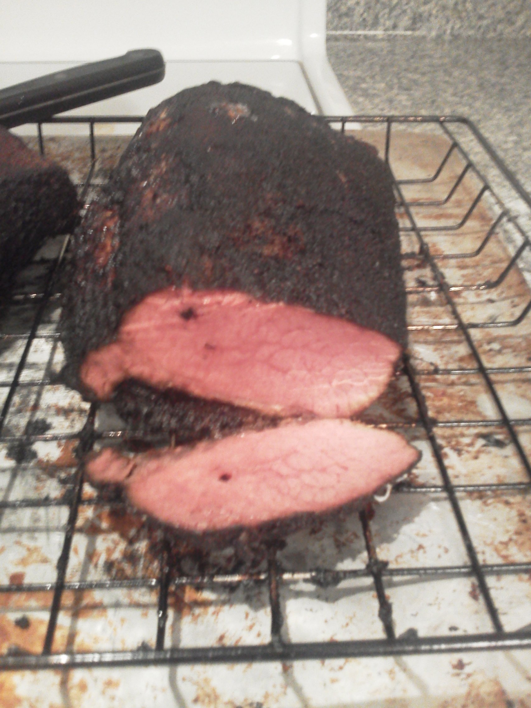 8# Pork Belly turned Bacon and 2 Corned Beef Flats turned Pastrami. I've done the Pastrami before, but it was my first time makin bacon. The Pork Belly was a lot thinner than I expected, but it came out pretty good! The Pastrami is a copycat recipe to Katz's Pastrami. The Bacon is mostly a brown sugar/maple syrup glaze. I have to admit though, I didn't soak the briskets long enough. They came out saltier than the first time I made em. Luckily it's an easy fix! Use cole slaw on your Reuben instead of saurkraut! Amost forgot! They were smoked with Apple Bisquettes