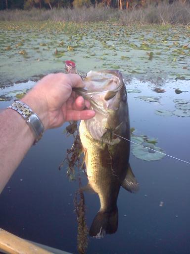 The bass in the photo, best bass of the day, hit a 3" popper which turned out to be the best lure choice of the day landing about 6 on it. I did catch 2 on a spinner bait, a couple on a crank bait, and one on a Spook. There was NO action once again on any frog style baits worked in the pads and other surface vegetation in shallow water. Nor did anything else produce in the pads, which I hit hard early on and late both. They haven't produced all year.